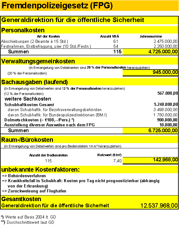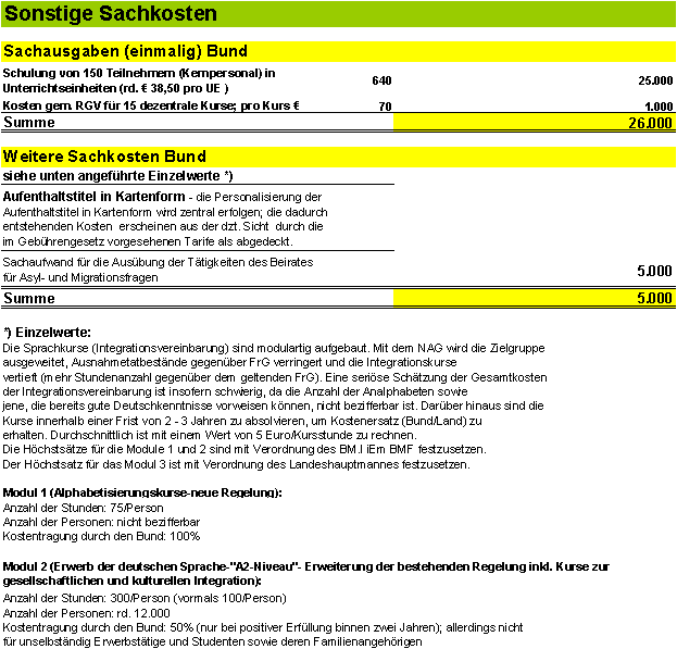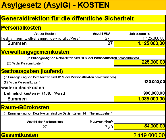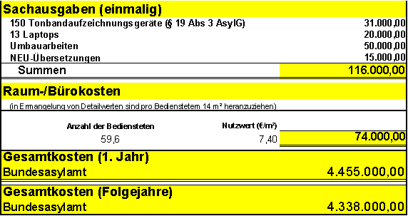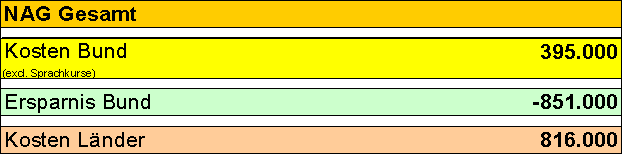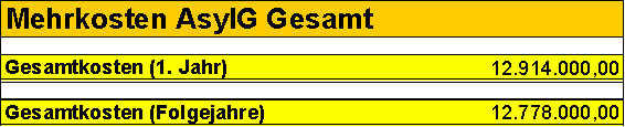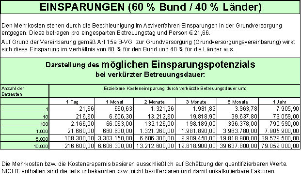 Die vorgeschlagenen Regelungen bewirken Mehrausgaben für Bund und Länder. Die vorgeschlagenen Maßnahmen werden – auch im Sinne der Empfehlungen der Landeshauptleutekonferenz – zur Beschleunigung der Asylverfahren und somit absehbar zu einer massiven Einsparung führen. Speziell für den Bereich der Länder ist in einer Gesamtschau keine wesentliche zusätzliche finanzielle Belastung zu erwarten.