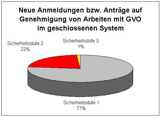 [3] Zur Anzahl der beim Bundesministerium für Gesundheit und Frauen angemeldeten Arbeiten in der Sicherheitsstufe 1 ist anzumerken, dass diese Zahl jene anmeldepflichtigen Arbeiten mit transgenen Wirbeltieren in einer gentechnischen Ablage (§ 19 Z 6 GTG) nicht enthält, für die eine Genehmigung des Tierversuches nach dem Tierversuchsgesetz 1988 im Rahmen ihres Geltungsumfanges die Anmeldung nach dem GTG ersetzt (§ 27 Abs. 1 GTG), da diese Anmeldungen in den Kompetenzbereich der Länder fallen.