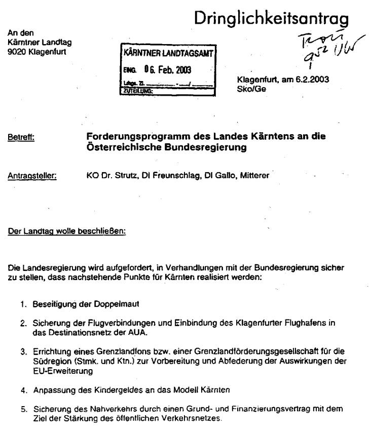 2003" mit dem "Forderungskatalog des Landes Kärnten an die