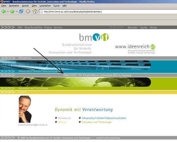 Nichts anderes als ein Missbrauch von Ministeriumsressourcen zu parteipolitischen Zwecken ist es, wenn Ihr Staatssekretär Eduard Mainoni sowohl über die Homepage des BMVIT als auch via Aussendung (siehe Beilage weiter unten) zur Präsentation des zukünftigen Weges der Salzburger BZÖ einlädt. Da dies des weiteren auch eine Quersubventionierung des BZÖ, dem bekanntlich auch der Adressat dieser Anfrage angehört, auf Kosten der Steuerzahler darstellt, richten die unterzeichneten Abgeordneten an den Bundesminister für Verkehr, Innovation und Technologie nachstehende