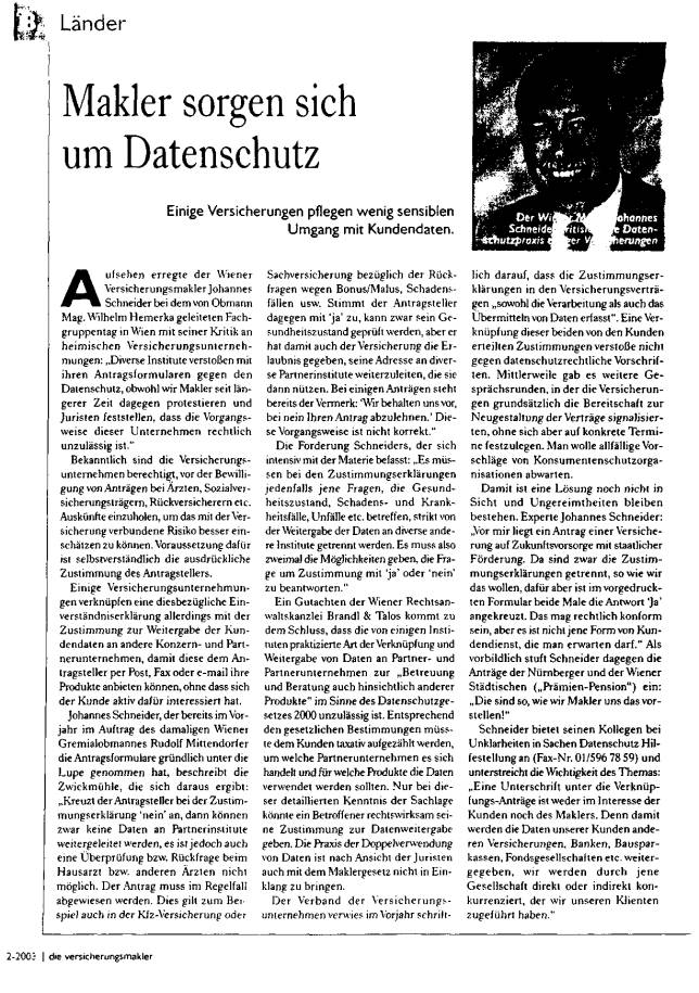 Versicherungsangelegenheiten (2/03) enthält auf Seite 8 den Artikel „Makler sorgen
