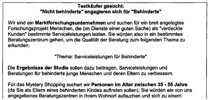 Sie versuchte sich für dieses „Testkäufer" Angebot, also das mystery shopping zu