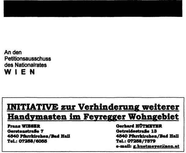 Als Sprecher der ,,Initiative zur Verhinderung weiterer Handymastanlagen im Feyregger Wohngebiet bitten wir um Behandlung unserer Anliegen sowie für unsere berechtigten Bedenken und hoffen auf positive Nachricht
