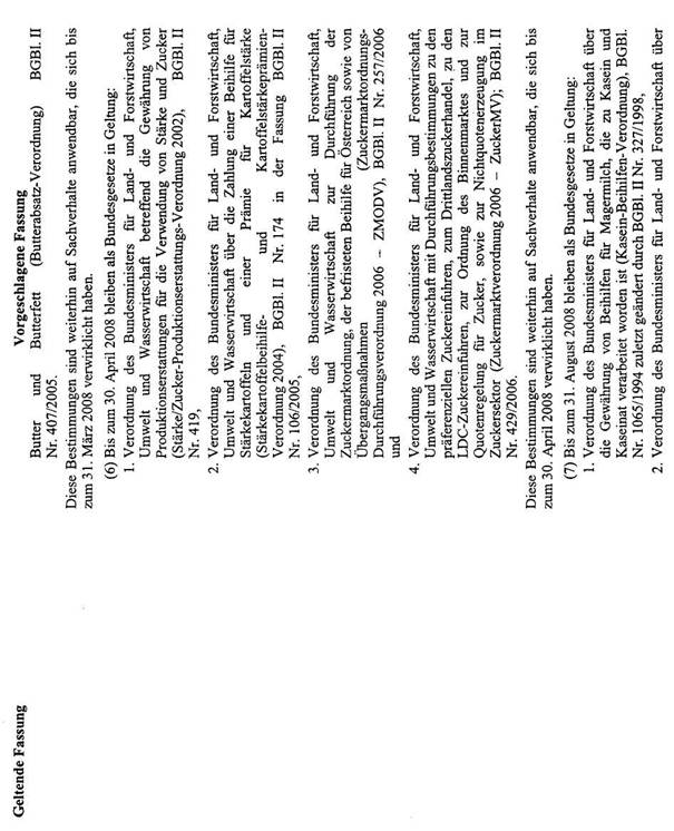 Für die Bereiche Kartoffelstärke und Zucker sind zum Teil die zu ändernden gemeinschaftsrechtlichen Durchführungsbestimmungen noch ausständig, sodass die derzeitigen Verordnungen erst mit Ablauf des 30. April 2008 aufgehoben werden und die Neuerlassungen damit mit 1. Mai 2008 wirksam werden können.