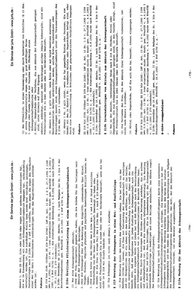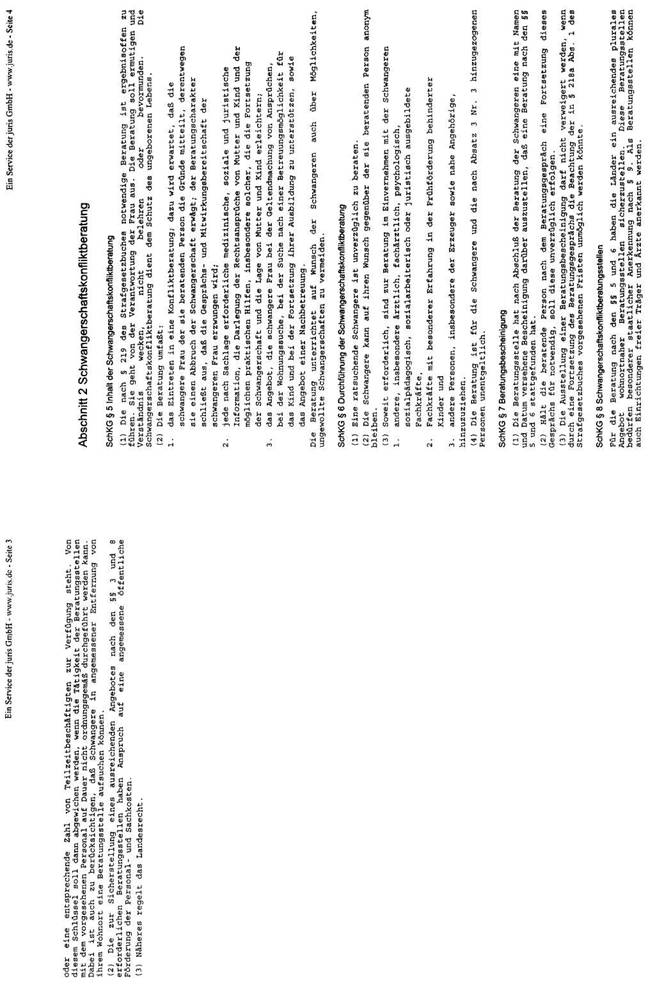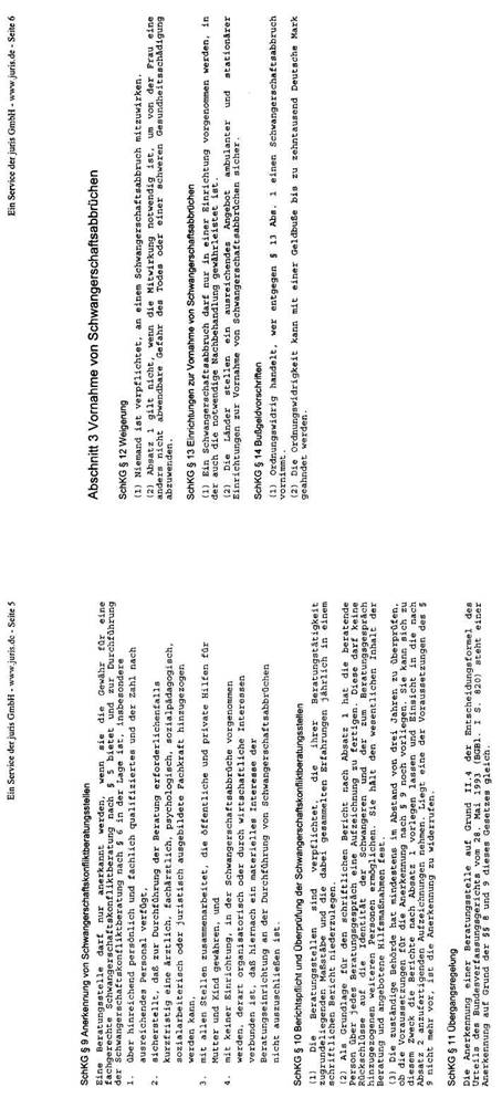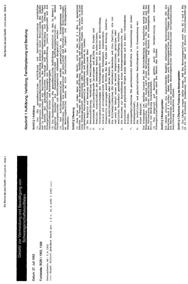 In der Bundesrepublik Deutschland liegt eine, in den Grundzügen mit der österreichischen vergleichbare Rechtslage vor. Mit dem großen Unterschied, dass dort in den §§ 218a ff dStGB die Modalitäten dieser „vorhergehenden ärztlichen Beratung" konkretisiert werden. Mit dem im Jahre 1992 verabschiedeten „Gesetz zur Vermeidung und Bewältigung von Schwangerschaftskonflikten" wurde ein bundesweites Netz an Schwangerschaftskonfliktberatungsstellen errichtet und Vorgaben über den Inhalt der Beratung festgelegt. Laut § 219 Abs. 1 dStGB dient die Beratung dem Schutz des ungeborenen Lebens. Sie hat sich von dem Bemühen leiten zu lassen, die Frau zur Fortsetzung der Schwangerschaft zu ermutigen und ihr Perspektiven für ein Leben mit dem Kind zu eröffnen; sie soll ihr helfen, eine verantwortliche und gewissenhafte Entscheidung zu treffen.