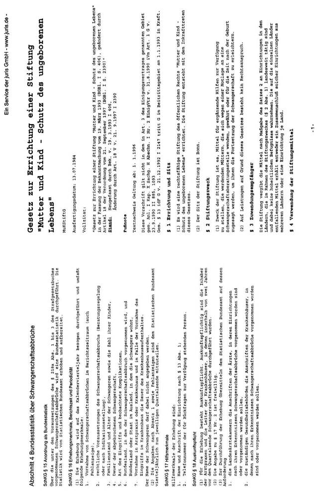 Mit dem im Jahre 1984 verabschiedeten „Gesetz zur Errichtung einer Stiftung „Mutter und Kind - Schutz des ungeborenen Lebens"" wurden überdies finanzielle Mittel vorgesehen, die für ergänzende Hilfen zur Verfügung gestellt werden. Damit sollen werdenden Müttern, die sich wegen einer Notlage an eine Schwangerschaftsberatungsstelle wenden, Mittel gewährt oder für die Zeit nach der Geburt zugesagt werden, um ihnen die Fortsetzung der Schwangerschaft zu erleichtern.