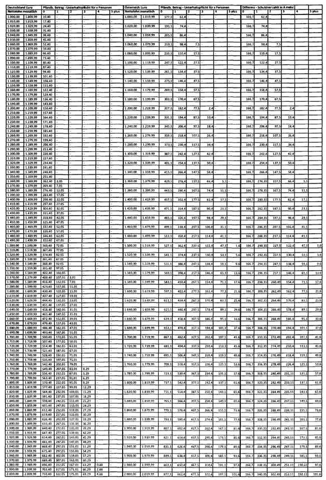 Die Leerzeilen ergeben sich aus den Unterschiedlichen Rundungsbeträgen (D - 10 Euro, A -20 Euro). In den letzten 5 Spalten wird die jeweilige monatliche Differenz zwischen den pfändbaren Beträgen in D und A bei gleichem Einkommen und der gleichen Anzahl an Unterhaltspflichten aufgelistet. Es handelt sich für A um die Liste unter der Annahme von 14 Gehältern (Grundbetrag 747,00 Euro)