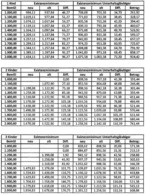 Auf der folgenden Seite werden die Tabellen betreffend Pfandungsfreigrenzen (D) und Existenzminimum (A) gegenübergestellt: