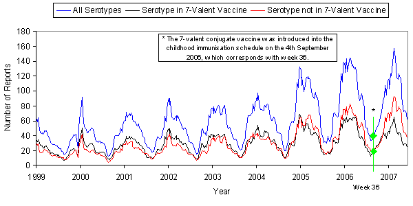 Eine Beobachtung der Epidemiologie in England, wo die Pneumokokkenimpfung am 4. September 2006 eingeführt wurde, zeigt eine gute Wirksamkeit gegen die im Produkt enthaltenen Subtypen.