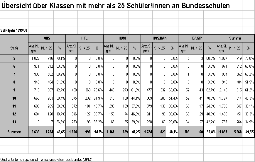 Für den Bereich der Bundesschulen gibt die angeschlossene Beilage B für das Schuljahr 2000/01 eine Übersicht über die Zahl der Klassen gesamt, die Anzahl der Klassen mit mehr als 25 Schülerinnen und Schülern sowie deren prozentuelles Verhältnis zueinander auf Ebene der jeweiligen Schulstufe und Schulart.