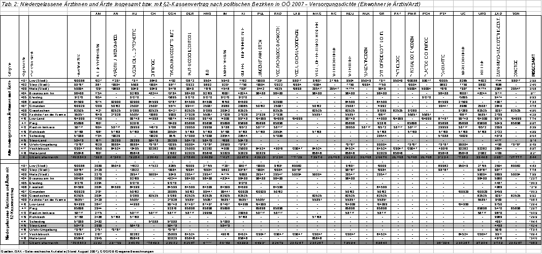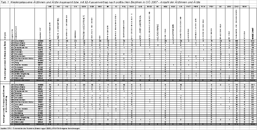 Per Stand August 2007 gab es laut Ärzteliste der Österreichischen Ärztekammer bzw. der Österreichischen Zahnärztekammer in OÖ insgesamt 2.584 niedergelassene Ärztinnen und Ärzte (davon 1.335 mit §2-Kassenvertrag); darunter befanden sich - exkl. Allgemeinmediziner und Zahnmediziner - insgesamt 1.076 Fachärztinnen und Fachärzte (davon 344 mit §2-Kassenvertrag); zur Verteilung dieser Fachärztinnen und Fachärzte auf die Bezirke in OÖ vgl. beiliegende Tab. 1.