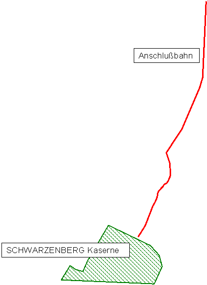 Der Bahnanschluss beginnt im Norden an der Westbahn und führt über 15 Grundstücke mit ca. 18.750 m² bis zur Bahnanlage in der Kaserne. Die zum Verkauf vorgesehene Anschlussbahn ab Kasernenzaun hat eine Gleislänge von 2.040 Metern. Auf den Grundflächen befinden sich Schienen, Schotter, Schwellen, Weichen, Signaltafeln und elektrische Eisenbahnkreuzungssignale; die Anschlussbahn ist nicht elektrifiziert (siehe dazu die Beilage).