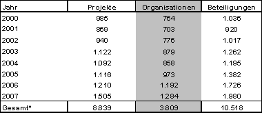 *Gesamt: Projekte und Beteiligungen sind in eindeutiger Art und Weise Jahren zurechenbar, Organisationen sind teilweise dieselben, weshalb der Gesamtwert nicht die Spaltensumme darstellt!