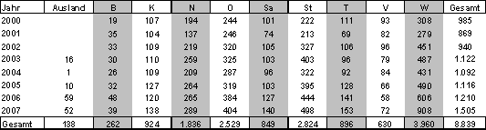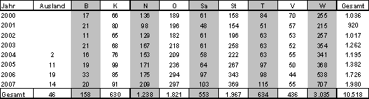 *Gesamt ist nicht die Summe der Zeile sondern die tatsächliche Anzahl an Projekten des Jahres.