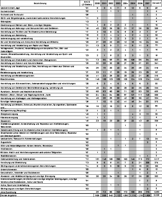 Die FFG fördert Forschungsförderung und stellt einen Großteil der vergebenen Mittel auch in einer Verteilung nach ÖNACE dar. Dies insbesondere im Bereich der Basisprogramme, wo eine Kennzeichnung der Projekte mit dem ÖNACE-Code seit vielen Jahren erfolgt. In den nachstehenden Beantwortungen wird für den Zeitraum 2000 bis 2004 auf die Daten des Bereichs Basisprogramme der FFG zurückgegriffen, für die Jahre 2005 bis 2007 auf alle durch die FFG betreuten Programme. Dabei steht nicht die Klassifizierung nach NACE im Vordergrund, sondern die Gesamtheit der durch die FFG abgewickelten Förderfälle.