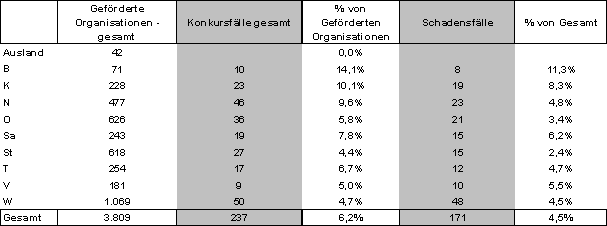 FFG-Tabelle 16: Konkursfälle und Schadensfälle (Anzahl von Organisationen je Bundesland im gesamten Anfragezeitraum)