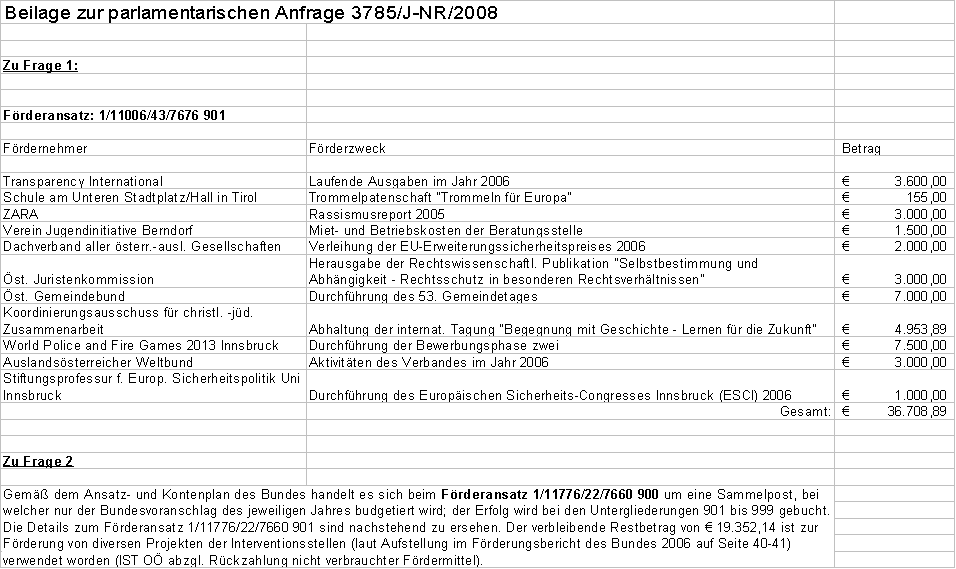 Die Abgeordneten Öllinger, Freundinnen und Freunde haben am 10. März 2008 unter der Nr. 3785/J an mich eine schriftliche parlamentarische Anfrage betreffend „Aufgliederung Förderungsbericht 2006“ gerichtet.