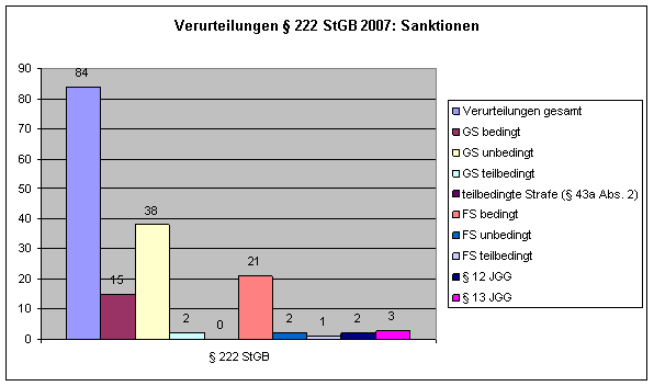 Die Statistik zu den Strafanzeigen (polizeiliche Kriminalstatistik) wird vom Bundesministerium für Inneres geführt. Aus der Verfahrensautomation Justiz (VJ) lässt sich die Anzahl der bekannt gewordenen gerichtlich strafbaren Handlungen nach § 222 StGB im Jahr 2007 nach Bundesländern aufschlüsseln: