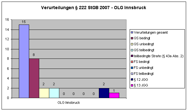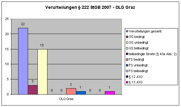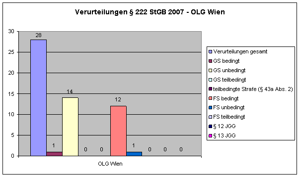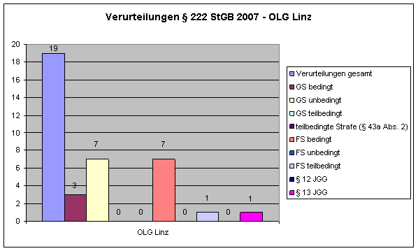 In den folgenden Tabellen werden die Daten aus der Verurteilungsstatistik der Statistik Austria für das Delikt nach § 222 StGB nach den verhängten Sanktionen in den Kategorien bedingte Geldstrafe, unbedingte Geldstrafe, teilbedingte Geldstrafe, teilbedingte Strafe nach § 43a Abs. 2 StGB, bedingte Freiheitsstrafe, unbedingte Freiheitsstrafe, teilbedingte Freiheitsstrafe und Verurteilungen nach § 12 und 13 JGG für das Bundesgebiet und gesondert für die vier OLG-Sprengel ausgewiesen.