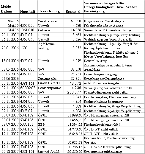 Bisher wurden in den Jahren 2004 und 2005 alle zu Unrecht ausbezahlten Beträge wieder eingezogen. Für das Jahr 2006 müssen noch 18.706,39 € eingezogen werden, für das Jahr 2007 noch 304.480,00 €. Das Verfahren für das Jahr 2007 ist noch gerichtsanhängig.