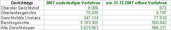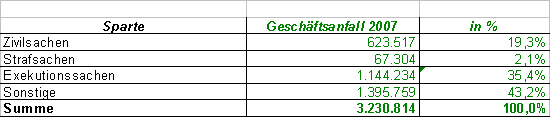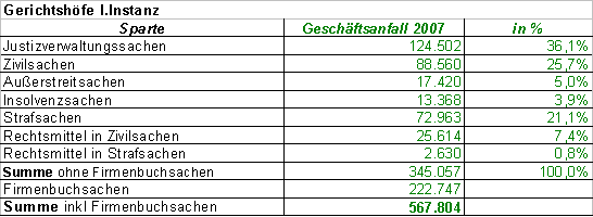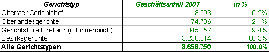 Bundesweit fielen bei allen ordentlichen Gerichten im Jahr 2007 insgesamt 3.658.750 Geschäftsfälle an. Die Aufteilung auf die einzelnen Gerichtstypen ist nachfolgend tabellarisch dargestellt. Wie in den letzten Jahren wird der Wert für die Gerichtshöfe erster Instanz ohne die Geschäftsfälle aus dem Firmenbuch (222.747) angeführt.