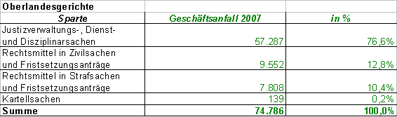 Beim Obersten Gerichtshof fielen im Jahr 2007 in Zivilsachen 1.199 ordentliche und 1.614 außerordentliche, gesamt daher 2.813 Rechtsmittelakten an. In Strafsachen wurden 817 Rechtsmittel verzeichnet. Eine gerichtsspezifische Aufstellung aller im Jahr 2007 eingebrachten Abänderungsanträge, sowie eine Auflistung aller stattgegebenen und zurückgewiesenen Anträge können dem angeschlossenen Beilagenkonvolut entnommen werden.