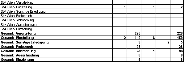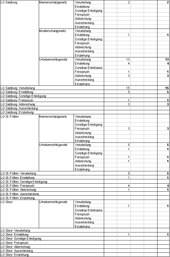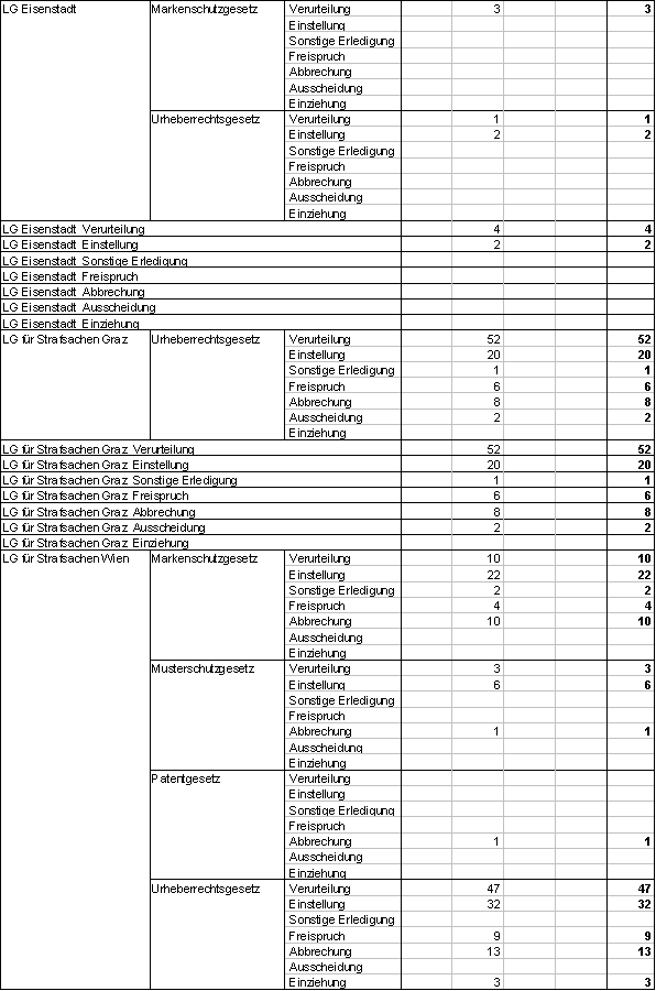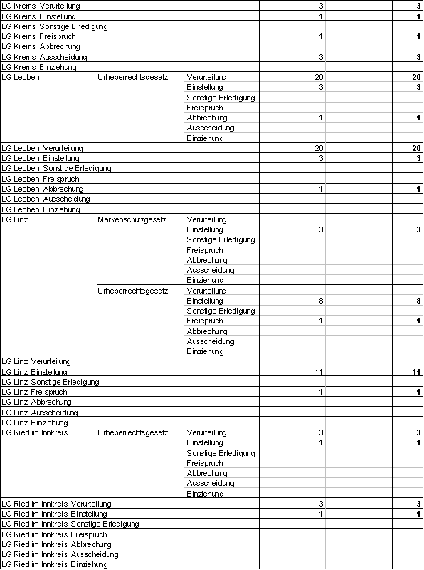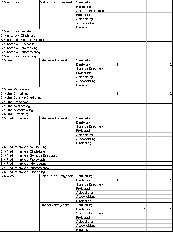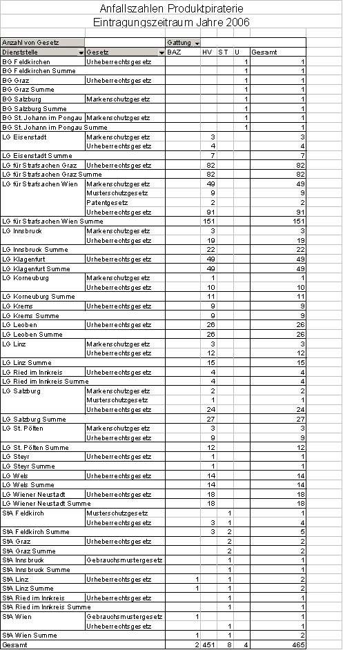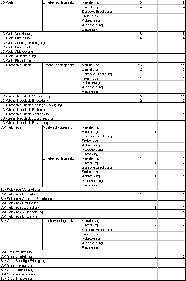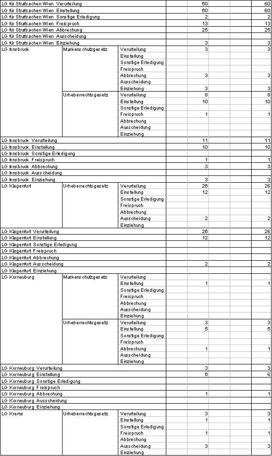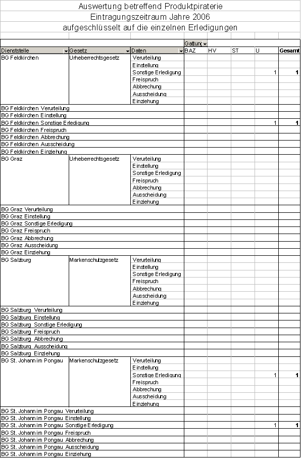 Für den Bereich der strafgerichtlichen Verfahren schließe ich die Beilagen B und C an, die die Auswertungen aus der Verfahrensautomation Justiz zur „Produktpiraterie 2006 enthalten. Den Tabellen können die nach Gerichten aufgeschlüsselten Anfalls- und Erledigungszahlen des Jahres 2006 entnommen werden – geordnet nach