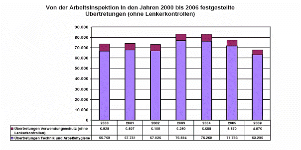 Zu den von Ihnen kritisierten „angemeldeten Kontrollen“ erinnere ich zunächst daran, dass die entsprechende gesetzliche Regelung im Arbeitnehmerschutz-Reformgesetz auf einer Sozialpartnereinigung auf höchster Ebene zustande gekommen ist und außerdem das jederzeitige, unangemeldete Betretungsrecht der Arbeitsinspektion in keiner Weise eingeschränkt, sondern vielmehr – ganz im Gegenteil – den Er-messensspielraum der Mitarbeiter/innen der Arbeitsinspektion in Richtung auf Kundenorientierung und Bürgernähe, aber auch im Interesse effizienter Kontrollen, erweitert hat. Jede Arbeitsinspektorin, jeder Arbeitsinspektor entscheidet selbst, ob eine Ankündigung einer Kontrolle erfolgt. Bei Verdacht auf Gefahr für Leben oder Gesundheit der Beschäftigten oder auf schwer wiegende Übertretungen ist die Anmeldung von Amtshandlungen nach wie vor ausdrücklich gesetzlich verboten. Die Möglichkeit der Arbeitsinspektor/innen, Amtshandlungen anzukündigen, hat im Übrigen keineswegs zu dem von Ihnen befürchteten Rückgang bei der Aufdeckung von Missständen geführt, wie das nachstehende Diagramm zeigt: