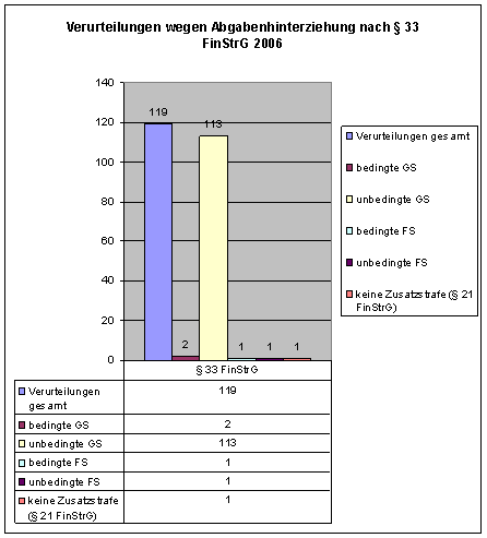 Im Jahr 2006 erfolgten österreichweit 119 rechtskräftige Verurteilungen wegen des Finanzvergehens der Abgabenhinterziehung nach § 33 FinStrG. Die Art der verhängten Strafen (bedingte und unbedingte Geld- und Freiheitsstrafen) können der nachfolgenden graphischen Darstellung entnommen werden. Eine Aufschlüsselung der Verurteilungen auf die einzelnen Strafgerichte bzw. Staatsanwaltschaften steht mir nicht zur Verfügung.