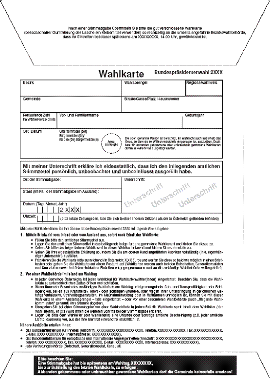 (2) Hierzu hat der Wähler den von ihm ausgefüllten amtlichen Stimmzettel in das beige-farbene Wahlkuvert zu legen, dieses zu verschließen und in die Wahlkarte zu legen. Sodann hat er auf der Wahlkarte durch Unterschrift eidesstattlich zu erklären, dass er den amtlichen Stimmzettel persönlich, unbeobachtet und unbeeinflusst ausgefüllt hat, anschließend die Wahlkarte zu verschließen und so rechtzeitig im Postweg, bei einer Stimmabgabe im Ausland allenfalls im Weg einer österreichischen Vertretungsbehörde oder einer österreichischen Einheit, an die zuständige Bezirkswahlbehörde zu übermitteln, dass die Wahlkarte dort spätestens am achten Tag nach dem Wahltag bis 14.00 Uhr einlangt. Aus der Wahlkarte mit der eidesstattlichen Erklärung haben die Identität des Wählers sowie der Ort und der Zeitpunkt (Datum und Uhrzeit) des Zurücklegens des verschlossenen beige-farbenen Wahlkuverts in die Wahlkarte hervorzugehen. Die eidesstattliche Erklärung muss vor Schließen des letzten Wahllokals in Österreich abgegeben worden sein.