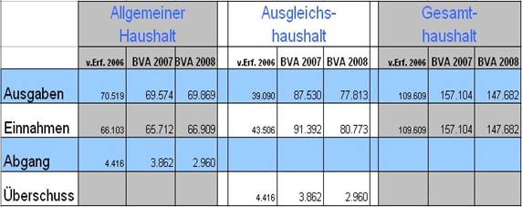 Der BVA-E 2008 weist im allgemeinen Haushalt Ausgaben von 69,87 Mrd. € und Einnahmen von 66,91 Mrd. € aus. Das ergibt einen Abgang von 2,96 Mrd. € oder rund 1,07% des BIP. Die Ausgaben sind um 0,4% höher veranschlagt als für 2007. Die Einnahmen steigen um 1,8%. Im Ausgleichshaushalt 2008 sind die Ausgaben mit 77,81 Mrd. € präliminiert. Die Einnahmen des Ausgleichshaushalts sind mit 80,77 Mrd. € budgetiert. Der Überschuss in Höhe von 2,96 Mrd. € entspricht wieder dem Abgang im allgemeinen Haushalt.