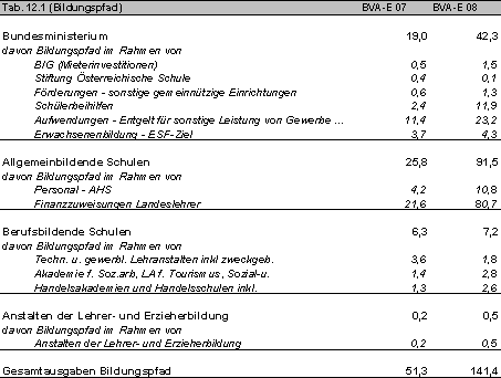 Der radikale Sparkurs von Bildungsministerin Elisabeth Gehrer wird abgemildert. Eine Bildungswende ist in Kapitel 12 (Bildung) dennoch nicht erkennbar. In der Steigerung der Bildungsausgaben für 2007 sind die Gehaltserhöhung und der Struktureffekt enthalten. Das heißt, dass das tatsächliche Geld für bildungspolitische Maßnahmen deutlich geringer ist als dargestellt. Für 2008 ist nur der Struktureffekt budgetiert. Die KlassenschülerInnenzahlen in Volks- und Hauptschulen könnten mit den zusätzlichen LehrerInnenressourcen spürbar sinken, wenn weiter auf Kürzungen beim Schülerrückgang verzichtet wird. In den AHS-Unterstufen allgemein werden kleinere Klassen aber nicht möglich sein.