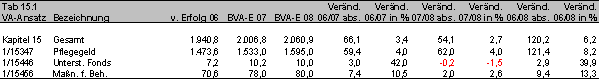 Keine der im Regierungsübereinkommen genannten „großen Brocken“ wie etwa die Schaffung einer Mindestsicherung oder die Ermöglichung einer leistbaren Pflege und Betreuung findet im Kapitel 15 eine Bedeckung. Lediglich in den Festlegungen für die Budgetüberschreitungen scheinen „magere“ € 18 Mio (2007) und € 34 Mio (2008) für Pflege auf. Diese sind jedoch an Leistungen anderer Gebietskörperschaften geknüpft.
