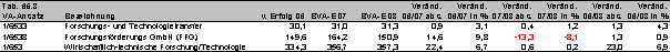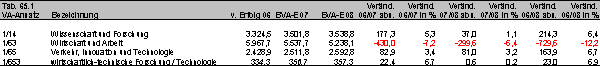 Der Bereich Forschung und Entwicklung ist durch den besonderen Erfindungsreichtum in seiner budgetären Darstellung gekennzeichnet. Bei den Ausgaben ist grob zwischen zwei Darstellungsarten zu entscheiden: (a) jene Budget(teil)kapitel, welche mit Forschung in Beziehung zu bringen sind. Diese Summe enthält auch Ansätze ohne Forschungscharakter. (b) Die Summe aller nach ihrer Forschungsrelevanz gewichteten Ansätze, die sich über das gesamte Budget verstreut finden. Diese Summe besitzt den Charakter eines Indikators, nicht eines konkreten Ansatzes. Darstellungsart (a) betrifft vorrangig die Kapitel 14 (Wissenschaft und Forschung), 63 (Wirtschaft und Arbeit) und das Kapitel 65 (Verkehr, Innovation und Technologie); im letzteren besonders den Titel 653 (wirtschaftlich-technische Forschung / Technologie). Auffällig der Rückgang 2006/07 in Kapitel 63 (7,2%) sowie generell die minimalen Steigerungsraten für 2007/08 (Tab. 65.1).
