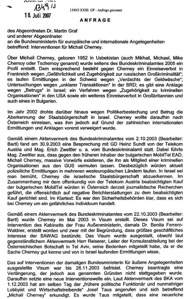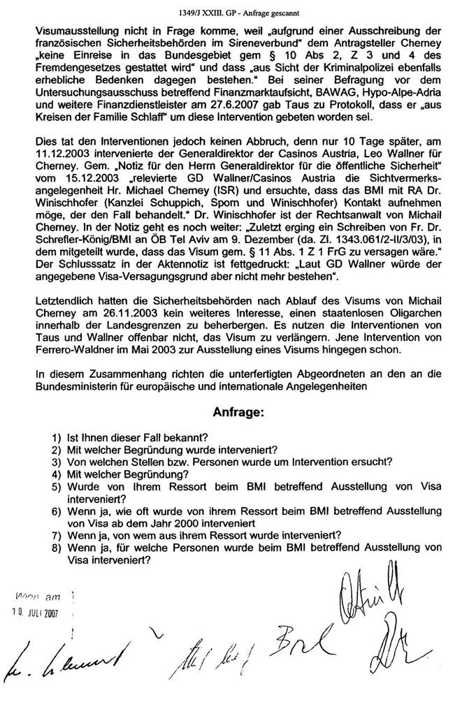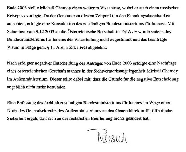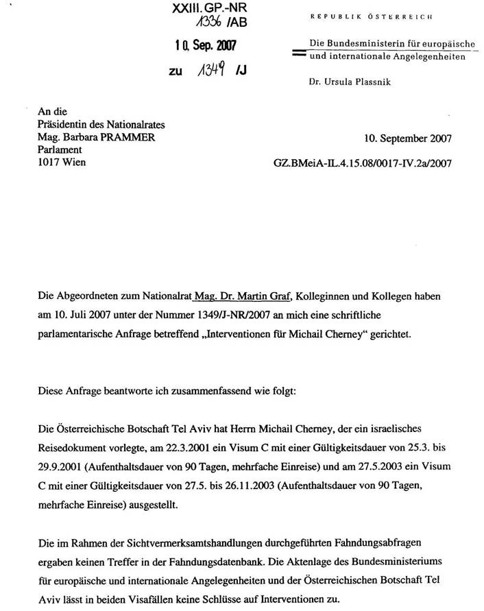 8) Gemäß Ihrer Anfragebeantwortung 1336/AB vom 10.9.2007 wurde Michail Cherney bereits am 22.3.2001 ein Visum ausgestellt. Gab es auch dafür Interventionen?