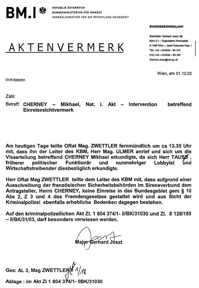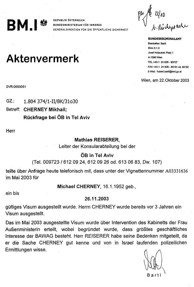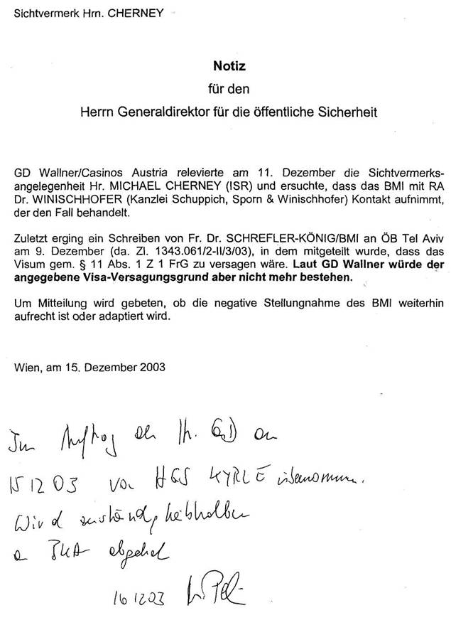 Aus diesen Aktenvermerken geht eindeutig hervor, dass das im Mai 2003 ausgestellte Visum „über Intervention des Kabinetts der Frau Außenministerin" erteilt wurde.