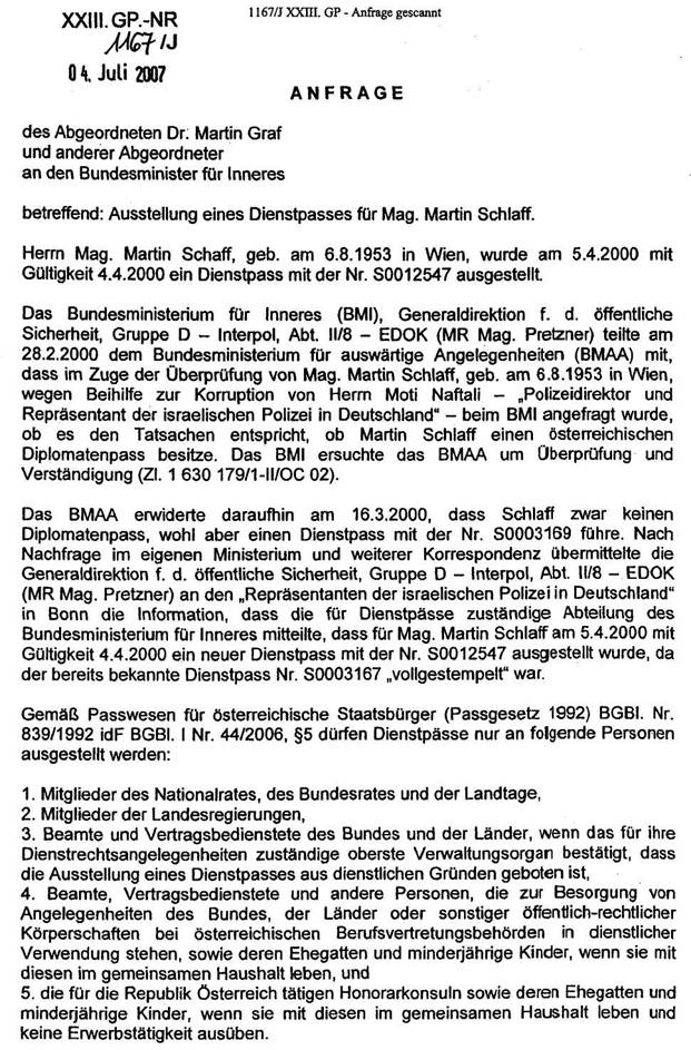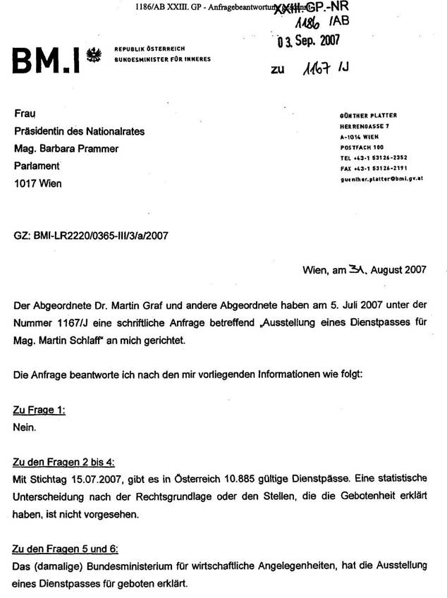 Am 4.7.2007 hat der Abgeordnete Dr. Martin Graf bez. des Dienstpasses für Martin Schlaff an den Bundesminister für Inneres eine Anfrage (1167/J) gestellt. Aus der Beantwortung (1186/AB) vom 31.8.2007 geht hervor, dass das Bundesministerium für Wirtschaft und Arbeit die Ausstellung des Dienstpasses für geboten erklärt hat.