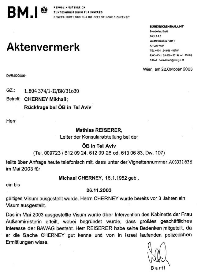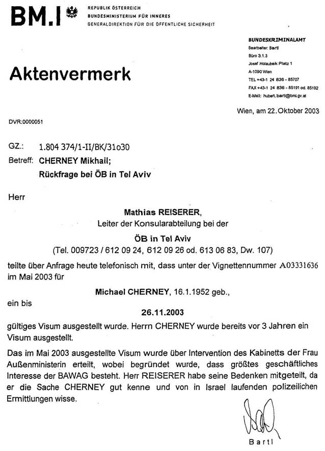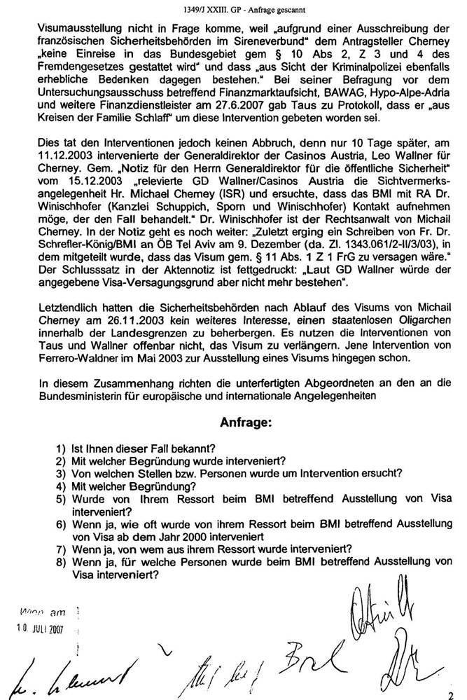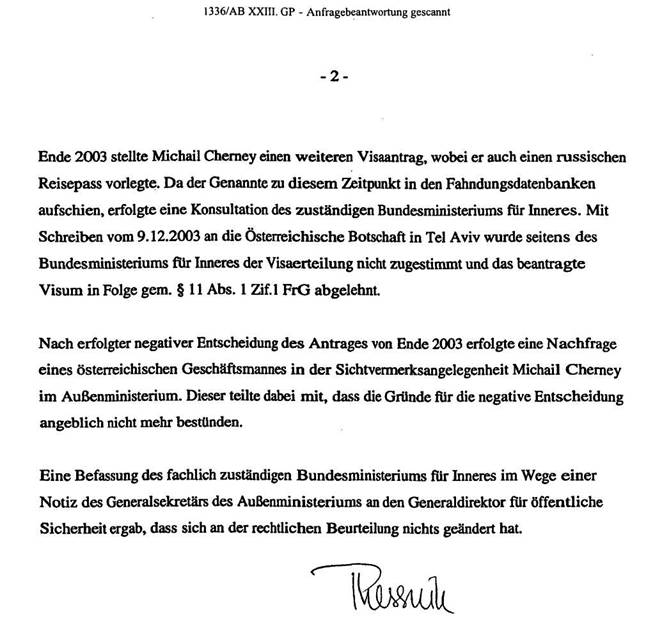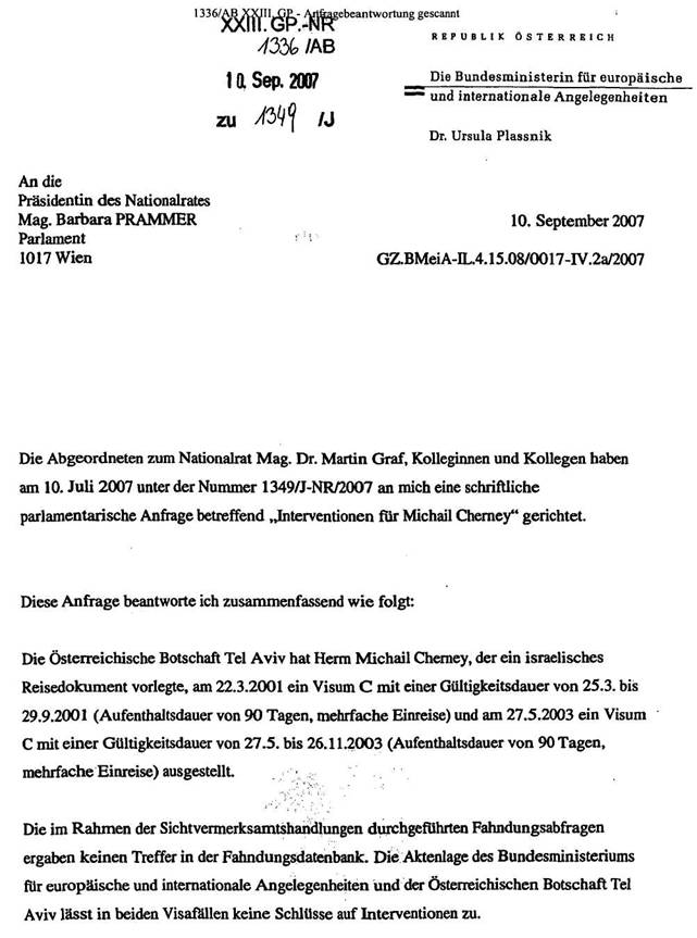 8) Gemäß Ihrer Anfragebeantwortung 1336/AB vom 10.9.2007 wurde Michail Cherney bereits am 22.3.2001 ein Visum ausgestellt. Gab es auch dafür Interventionen?