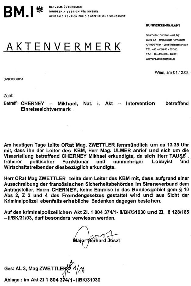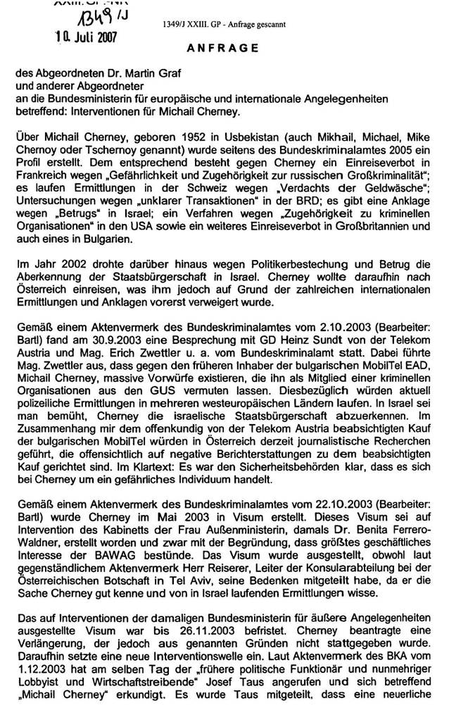 Der Zeitschrift „Profil" wurden jedoch Aktenvermerke des Bundeskriminalamtes zugespielt, die zum Teil auch im Profil Nr. 27 vom 2. Juli 2007, S. 44-48, faksimiliert veröffentlicht wurden. Im Zuge der Recherchen zu den Untersuchungsgegenständen 5 und 6 (gem. Antrag auf Einsetzung des Untersuchungsausschusses vom 30.0.2006 - Prüfauftrag) des Untersuchungsausschusses betreffend Finanzmarktaufsicht, BAWAG, Hypo-Alpe-Adria und weitere Finanzdienstleister wurden diese Aktenvermerke auch uns von anonymer Seite zugetragen und werden nunmehr neben der Anfrage 1349/J und Ihrer Anfragebeantwortung 1336/AB zu dieser gegenständlichen Anfrage in Kopie beigelegt.