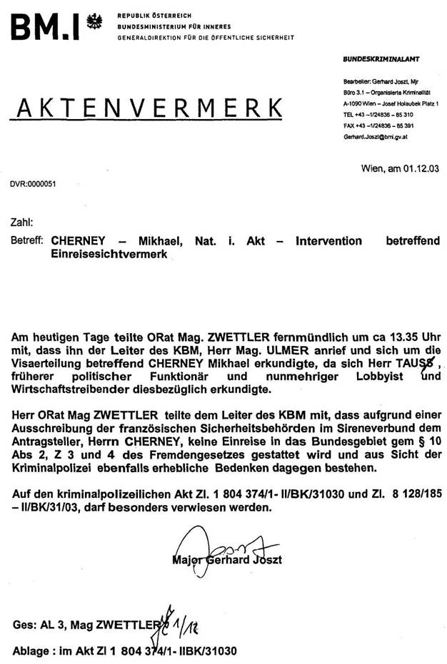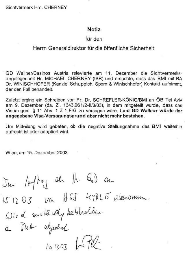 Aus diesen Aktenvermerken geht eindeutig hervor, dass das im Mai 2003 ausgestellte Visum „über Intervention des Kabinetts der Frau Außenministerin" erteilt wurde.