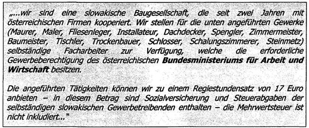 Zunehmend ist allerdings festzustellen, dass mit allen Mitteln versucht wird, Arbeitskräfte in Österreich einzusetzen ohne allerdings dabei die geltenden gesetzlichen Bedingungen lückenlos einzuhalten. Nun wird versucht im großen Stil über die so genannte „Scheinselbständigkeit" die gesetzlichen Vorgaben zu umgehen. Obwohl in den meisten Fällen davon auszugehen ist, dass es sich bei den ausländischen Arbeitskräften um Arbeitnehmer im klassischen Sinn handelt, besteht der dringende Verdacht, dass diesem versuchten Lohndumping vom Bundesministerium für Wirtschaft und Arbeit sogar noch Vorschub geleistet wird. Immer wieder werden Gewerbeberechtigungen, Anerkennungen und Gleichachtungen in erheblichen Umfang ausgestellt, und zwar für Personen, die weder selbständige Arbeitnehmer sind, noch in der Lage wären, auf eigene Rechnung und Gefahr ein Gewerbe zu betreiben. Sie werden von dubiosen Firmen aus dem Ausland vermittelt und in Österreich als weisungsgebundene und abhängige Arbeitnehmer schlicht und ergreifend ausgebeutet.