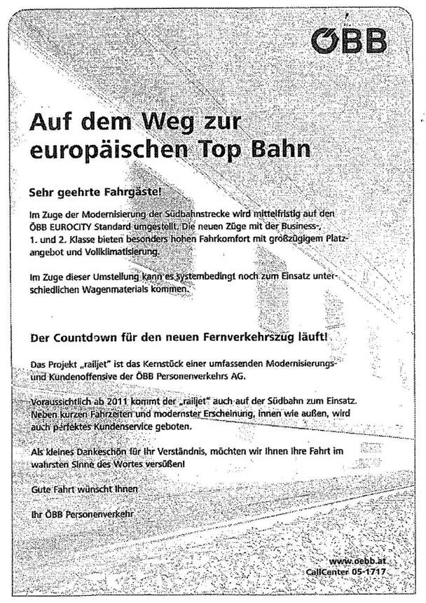 Als Versuch der Wiedergutmachung wird nun in den Zügen teilweise Schokolade als Trostmittel ausgeteilt und ein Zettel verteilt. Dieser Zettel (vgl. Anlage) zeigt immerhin ein schemenhaftes Foto zeitgemäßen Rollmaterials, vertröstet im Hinblick auf dessen Einsatz jedoch auf das Jahr 2011 - „voraussichtlich". Anders gesagt: Die Fahrgäste auf der Südbahnstrecke sollen insgesamt gut fünf Jahre zum Vollpreis in ungeeigneten Garnituren unterwegs sein, teilweise mehrere Stunden täglich - ein Kundenvertreibungsprogramm allererster Güte. Dass die ÖBB „Auf dem Weg zur europäischen Top Bahn" (vgl. Anlage) sein sollen, ist für die Fahrgäste solcherart nicht nachzuvollziehen. Schokolade statt akzeptabler Angebotsqualität ist unter diesen Umständen eher eine Provokation als eine Entschädigung.
