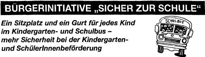 Unterstützen Sie meine Initiative „Sicher zur Schule - Ein Sitzplatz und ein Gurt für jedes Kind im Kindergarten- und Schulbus" bis Ende Feber mit Ihrer Unterschrift - damit sich das Parlament mit der geforderten 1:1-Regelung für den täglichen Schulweg der Kinder befassen kann. Die Unterschriftenliste finden Sie umseitig - einfach aus der Zeitung trennen und ausgefüllt bis spätestens 28. Feber 2006 im Gemeindeamt abgeben.