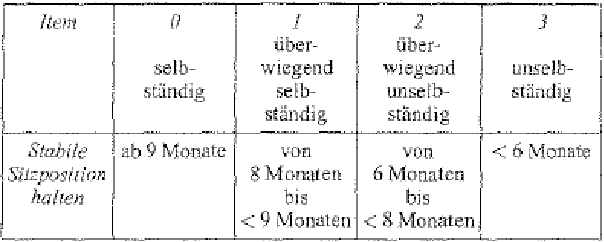 • Mit 9 Monaten können 90% der Kinder sich ohne Hilfe aufsetzen und sitzen mit stabiler Kopf- und Rumpfkontrolle. Sie benötigen keinerlei personelle Hilfe mehr und gelten in diesem Item nun als "selbständig".