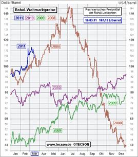 Ein Blick auf die beiden Grafiken untermauert die Analyse des ARBÖ. Wären die Preiserhöhungen nur durch die Rohölpreise erklärbar, dann müsste nämlich Sprit an den Zapfsäulen weit unter den Preisen von 2008 liegen. Faktum ist: Die Preise sind annähernd gleich. Spitzenpreise haben mittlerweile allerdings bereits die 1,5 Euro-Grenze durchbrochen.Vergleich Verbraucherpreise zu Rohölpreisen