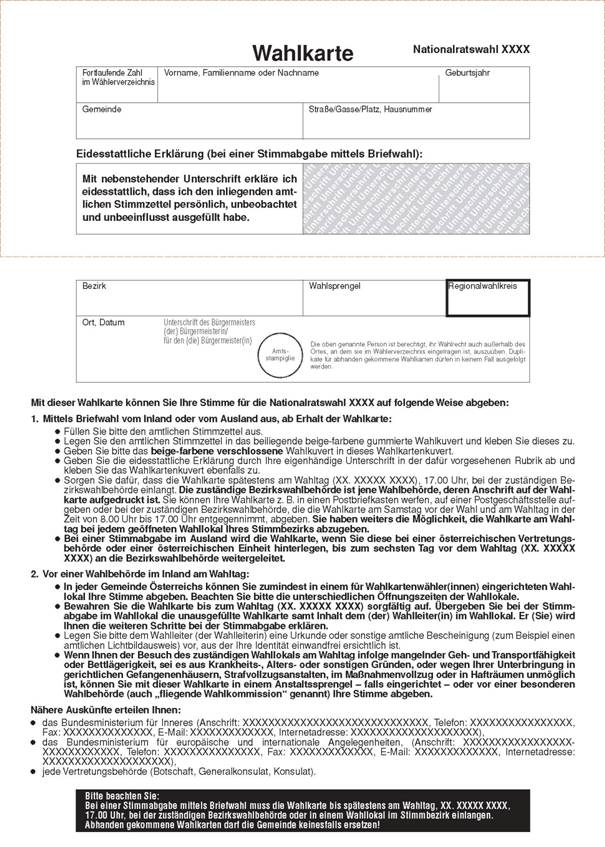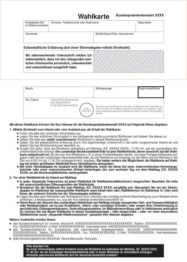 den amtlichen Stimmzettel persönlich, unbeobachtet und unbeeinflusst ausgefüllt hat. Anschließend hat er die Wahlkarte zu verschließen und entweder so rechtzeitig an die Bezirkswahlbehörde zu übermitteln, dass die Wahlkarte dort spätestens am Wahltag, 17.00 Uhr, einlangt, oder am Wahltag in einem Wahllokal des Stimmbezirks der Bezirkswahlbehörde während der Öffnungszeiten des Wahllokals abzugeben. Bis zum sechsten Tag vor dem Wahltag ist eine Wahlkarte für den Fall, dass ihre Übermittlung bei einer Stimmabgabe im Ausland im Weg einer österreichischen Vertretungsbehörde oder einer österreichischen Einheit erfolgt, an die zuständige Bezirkswahlbehörde weiterzuleiten. Die Weiterleitung einer danach vorgelegten Wahlkarte durch eine österreichische Vertretungsbehörde oder eine österreichische Einheit an die zuständige Bezirkswahlbehörde ist zulässig. Die Kosten für eine Übermittlung der Wahlkarte an die Bezirkswahlbehörde im Postweg hat der Bund zu tragen.