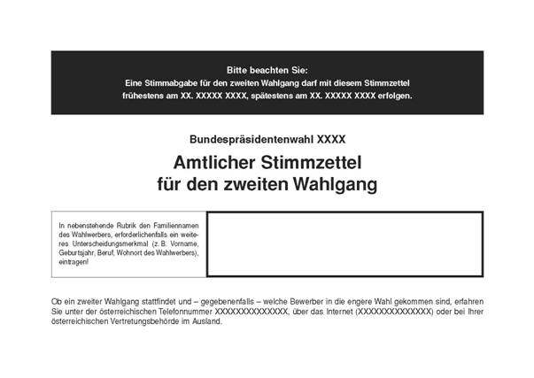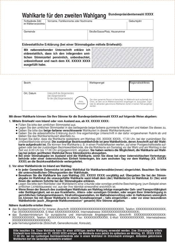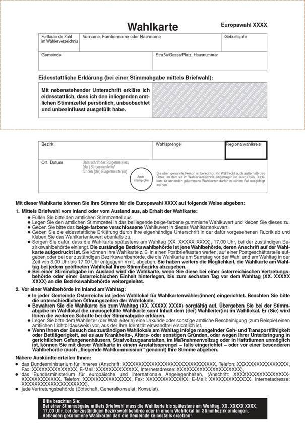 (4) Wird dem Antrag auf Ausstellung einer Wahlkarte stattgegeben, so sind neben der Wahlkarte auch ein amtlicher Stimmzettel und ein verschließbares Wahlkuvert, auf dem die Nummer des Landeswahlkreises aufgedruckt ist, auszufolgen. Letztere sind in den im Abs. 3 genannten Briefumschlag zu legen. Der Briefumschlag ist dem Antragsteller auszufolgen. Der Antragsteller hat den Briefumschlag bis zur Stimmabgabe sorgfältig zu verwahren. Mit dem Briefumschlag ist auch ein von den Landeswahlbehörden zur Verfügung zu stellendes Beiblatt auszufolgen, auf dem die veröffentlichten Wahlvorschläge des Landeswahlkreises angeführt sind.
