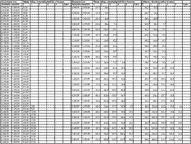 Die Leerzeilen ergeben sich aus den Unterschiedlichen Rundungsbeträgen (D – 10 Euro, A – 20 Euro). In den letzten 5 Spalten wird die jeweilige monatliche Differenz zwischen den pfändbaren Beträgen in D und A bei gleichem Einkommen und der gleichen Anzahl an Unterhaltspflichten aufgelistet. Es handelt sich für A um die Liste unter der Annahme von 14 Gehältern (Grundbetrag 747,00 Euro)