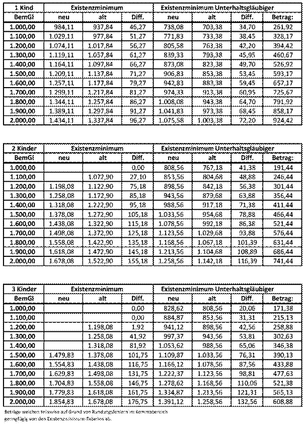 Auf der folgenden Seite werden die Tabellen betreffend Pfändungsfreigrenzen (D) und Existenzminimum (A) gegenübergestellt: