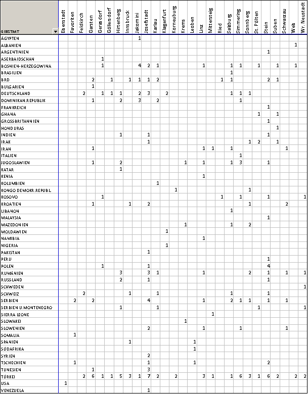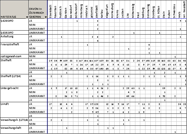 Die Anzahl jener Personen, die entweder nicht österreichische Staatsangehörige sind oder aber, obgleich österreichische Staatsangehörige, nicht in Österreich bzw. an einem unbekannten Ort geboren wurden und zumindest eine Vorhaft in Österreich aufweisen, ergibt sich – verteilt auf Vollzugsformen anstaltsbezogen – aus der nachstehenden Tabelle: